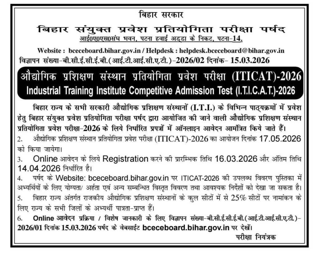 पटना : बिहार के सरकारी औद्योगिक प्रशिक्षण संस्थानों (आईटीआई) में नामांकन के लिए आयोजित होने वाली औद्योगिक प्रशिक्षण संस्थान प्रतियोगिता प्रवेश परीक्षा (आईटीआईसीएटी-2026) की अधिसूचना जारी कर दी गई है। यह परीक्षा Bihar Combined Entrance Competitive Examination Board (बीसीईसीईबी) द्वारा आयोजित की जाएगी। इसके माध्यम से राज्य के विभिन्न आईटीआई संस्थानों के अलग-अलग ट्रेडों में प्रवेश दिया जाएगा।